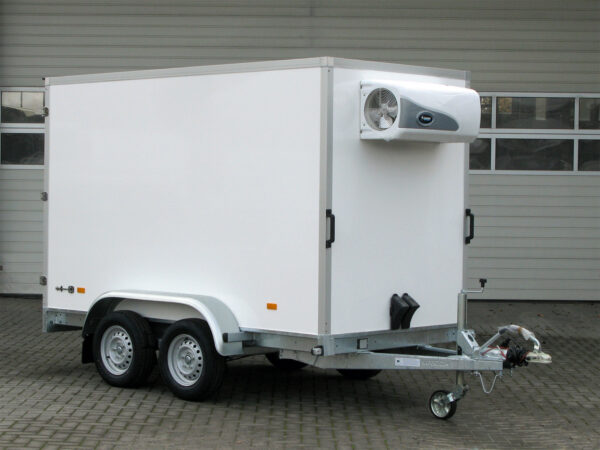 Dieses Modell ist serienmäßig mit hochwertigen Isolierplatten ausgestattet, die aus zwei Deckschichten aus Polyester, einer zweifachen Holzeinlage und einem Kern aus Isoliermaterial bestehen. Edelstahl-Scharniere und -Verschlüsse erhöhen die Langlebigkeit, während das leistungsfähige Kühlaggregat mit 1600 W eine konstante Temperatur von +2°C gewährleistet. Ein Verlängerungskabel, Innenbeleuchtung und eine abschließbare Bedienkonsole gehören ebenfalls zur Serienausstattung. Dank der glatten Gelcoat-Außenwände eignet sich der Kühlwagen zudem optimal für individuelle Werbeaufkleber.