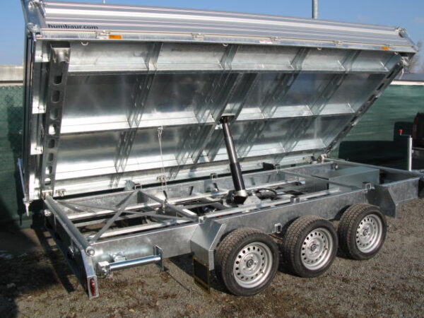 Der Humbaur HTK 3500.41 ALU Tridem ist ein robuster Dreiseitenkipper mit Aluminium-Bordwänden und einem zusätzlichen 600 mm hohen Bordwandaufsatz für mehr Ladekapazität. Ausgestattet mit drei Achsen und einer Bereifung von 195/50 R 13 C, bietet das Fahrzeug eine stabile Konstruktion mit einem tauchbadverzinkten Fahrwerk, Rahmen und Kippbrücke für maximale Haltbarkeit. Die aus einem Stück gefertigte Stahl-Kippbrücke sorgt für hohe Belastbarkeit, während acht im Brückenboden montierte Anbinderinge (je 800 kg Zugkraft) eine sichere Ladungssicherung ermöglichen. Ein hartverchromter 4-stufiger Qualitäts-Kippzylinder und eine hochwertige Hydraulikeinheit bieten zuverlässige Kippfunktionen. Der vormontierte Bohlenschacht dient als Vorbereitung für Alubohlen. Das Modell verfügt über eine Elektro- und Handpumpe sowie eine pendelbare Heckklappe. Der Kippwinkel beträgt ca. 45° nach hinten und seitlich.