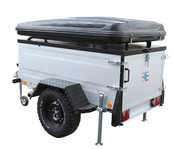 In dem einachsigen gebremsten Offroad-Kofferanhänger mit nach oben aufstell- und abschließbarem spritzwassergeschütztem Deckel mit Reling können Sie Ihr komplettes Camping-Equipment sicher verstauen. Der Deckel hat eine verstärkte Dachreling und stärkere Stoßdämpfer – damit wird die Traglast des Deckels auf 250 kg erhöht.