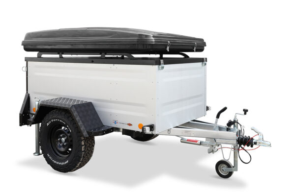 In dem einachsigen gebremsten Offroad-Kofferanhänger mit nach oben aufstell- und abschließbarem spritzwassergeschütztem Deckel mit Reling können Sie Ihr komplettes Camping-Equipment sicher verstauen. Der Deckel hat eine verstärkte Dachreling und stärkere Stoßdämpfer – damit wird die Traglast des Deckels auf 250 kg erhöht.