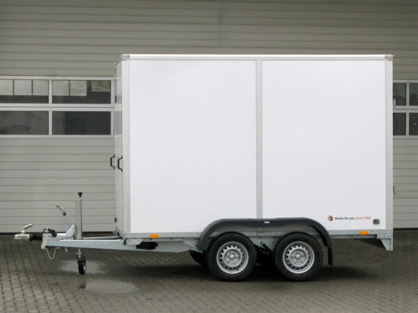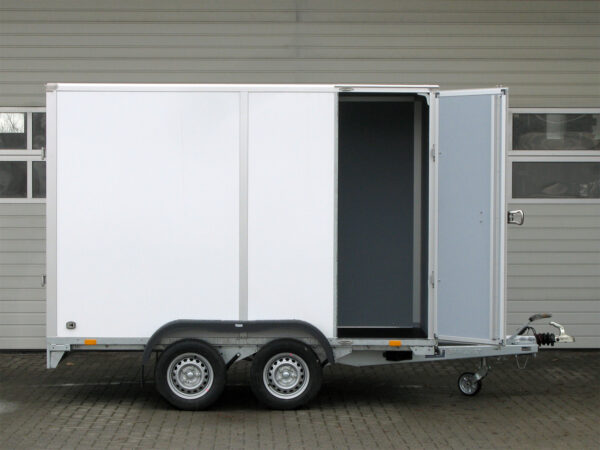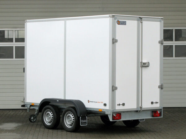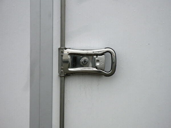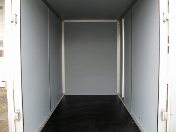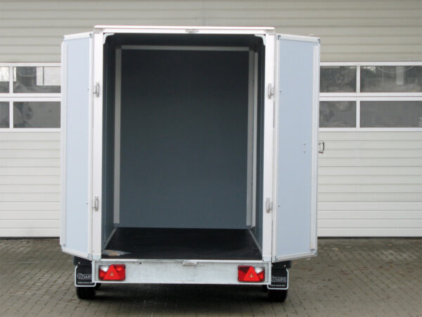 Für eine optimale Ladungssicherung sind durchgehende Airline-Schienen an den Seiten integriert. Die Doppelflügeltüre hinten ist mit einem Drehstangenverschluss ausgestattet.