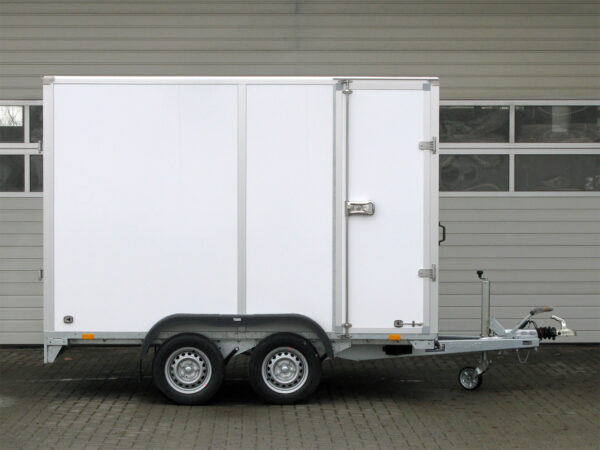 Dieser Anhänger verfügt über eine Auflaufbremse mit Rückfahrautomatik, geteilte Seitenwände und eine Innenbeleuchtung für bessere Sichtverhältnisse. Die V-Deichsel mit Stützrad garantiert eine stabile Handhabung.