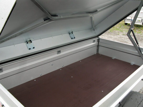 Der STEMA FT 8.5-20-10.1B überzeugt durch seine robuste Konstruktion und hohe Fahrstabilität. Dank der Sicherheits-V-Deichsel und des stabilen Fahrgestells ist eine optimale Straßenlage gewährleistet. Zudem sorgt die Gummifederachse mit Einzelradaufhängung für eine sichere und komfortable Fahrt. Die Bordwände bieten doppelten Korrosionsschutz durch GALVALUME-Beschichtung, und der rutschhemmende Siebdruckholzboden ermöglicht eine sichere Beladung. Dieser Anhänger ist mit einem Deckel ausgestattet und erlaubt eine maximale Geschwindigkeit von 100 km/h.