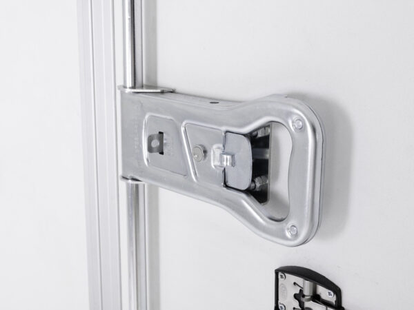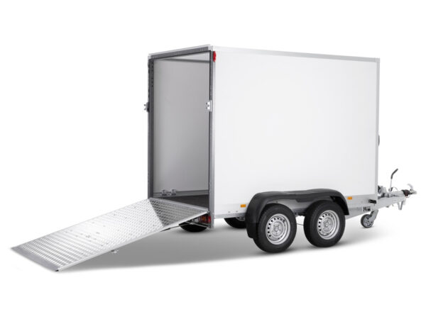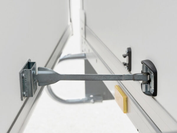 Die Rampe ist nach unten zu öffnen und belastbar bis 1.300 kg. Sie ist mit galvanisch verzinkten Türscharnieren und einem abschließbaren Drehstangenverschluss ausgestattet.