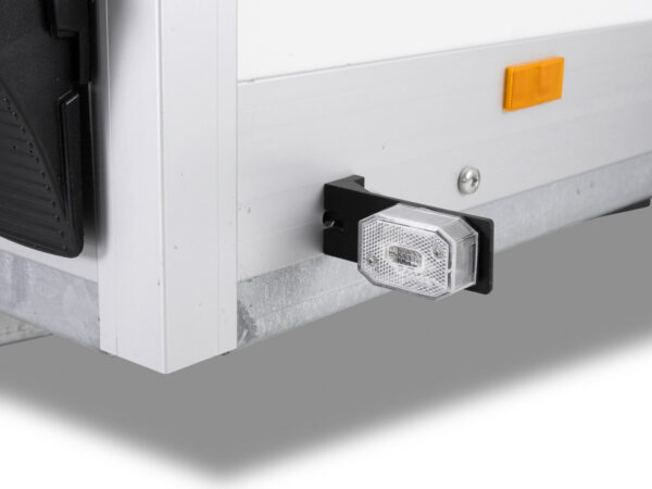 Der Aufbau umfasst eine feuerverzinkte Zugkugelkupplung mit Sicherheitsanzeige, ein geschweißtes Fahrgestell, ein Stützrad sowie einen Kennzeichenträger mit Rahmen und Leiste.