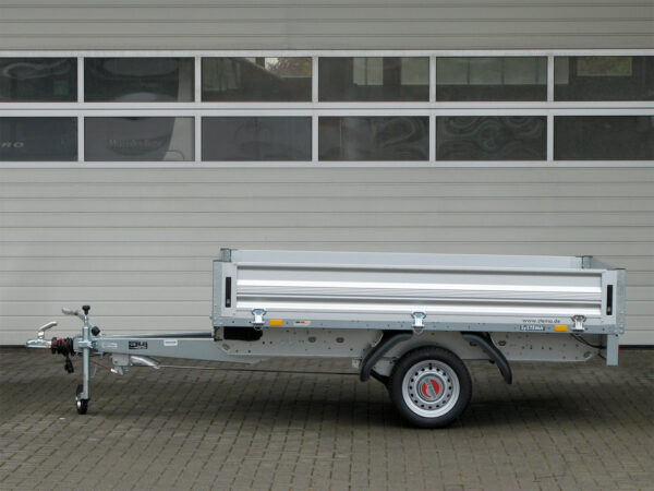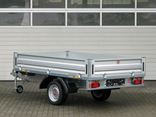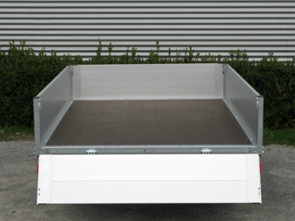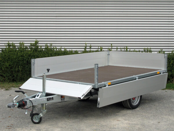 Hochwertiger Pritschenhochlader mit eloxierten Aluminium-Bordwänden und serienmäßiger 100 km/h Zulassung für sicheres Transportieren.