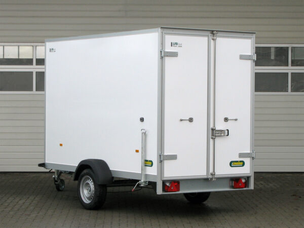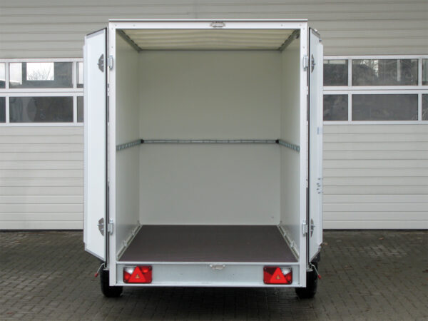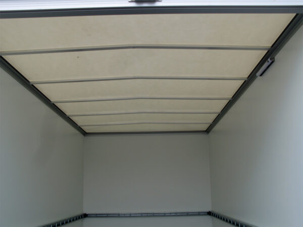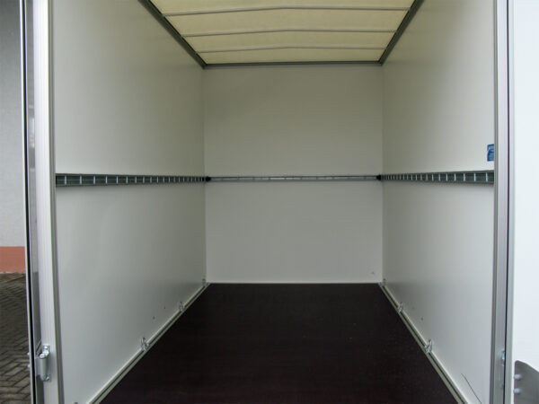 Die Seitenwände bestehen aus GFK-Stahl-Sandwich, und die doppelflüglige Hecktüre mit Verschluss sowie das transparente Lichtdach bieten Komfort beim Beladen. Für eine langlebige Ladefläche sorgt die 18 mm mehrfach verleimte Siebdruckplatte, die rutschhemmend und wasserfest ist.