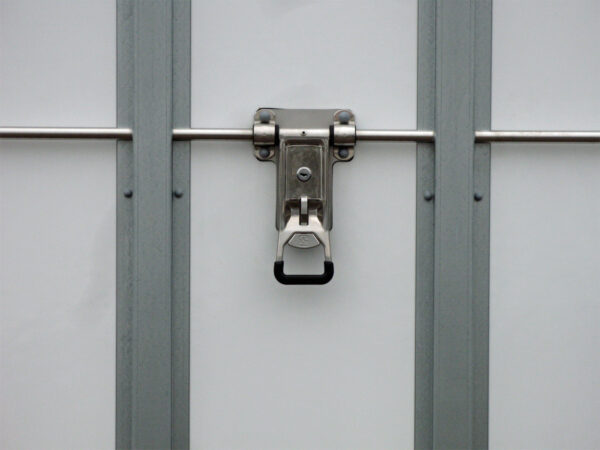 Die Wände und das Dach bestehen aus GFK-Stahl-Sandwich in RAL 9016: außen GFK für Beschriftung, innen Stahl für Stoßfestigkeit. Die Auffahrklappe ist rutschhemmend beschichtet und mit einem Edelstahl-Drehstangenverschluss und Edelstahl-Türfeststeller versehen.