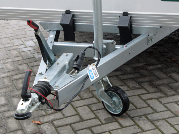 Das einzigartige, verwindungssteife Aluminiumfahrgestell sorgt für optimale Fahreigenschaften, während das verstärkte automatische Stützrad (Tragkraft: 500 kg) eine sichere Positionierung des beladenen Anhängers gewährleistet.