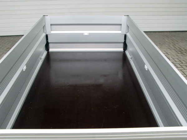 - Aluminium-Hohlprofil-Bordwände, eloxiert und hinten abklappbar mit versenkten Verschlüssen