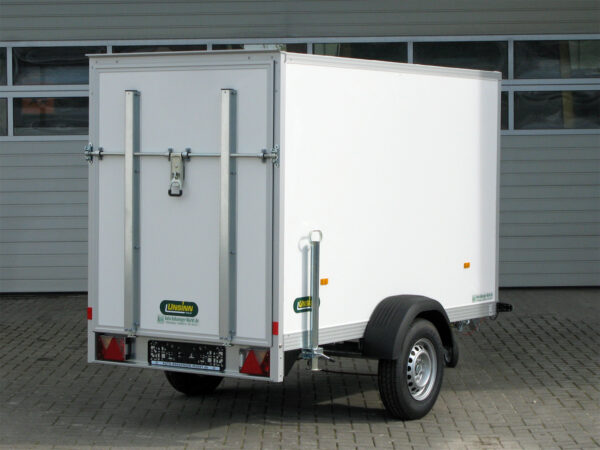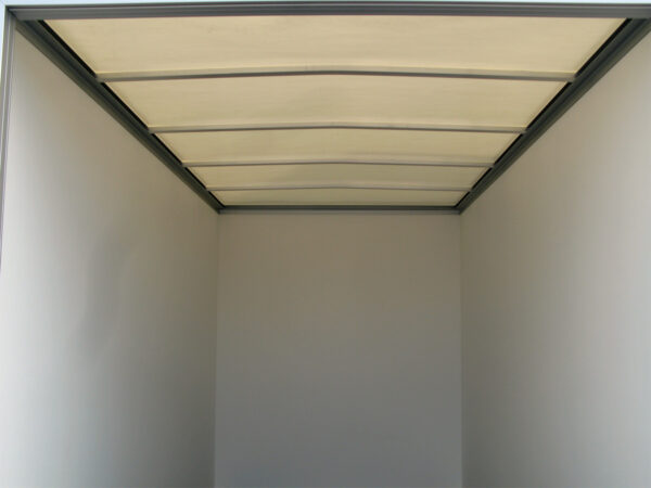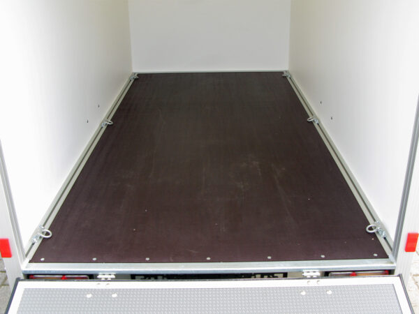 Die Plywood-Elemente mit PP-Oberfläche in weiß RAL 9010 verleihen dem Aufbau eine hochwertige Optik. Das transparente Lichtdach ermöglicht eine gute Sicht beim Beladen. Die Auffahrklappe mit rutschhemmender Oberfläche und zwei stabilen Unterzügen trägt bis zu 300 kg und ist mit einem querliegenden, verzinkten Drehstangenverschluss gesichert.